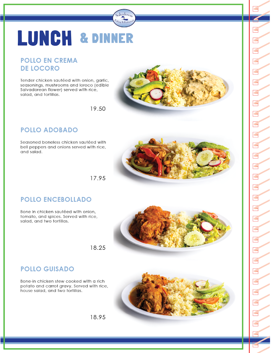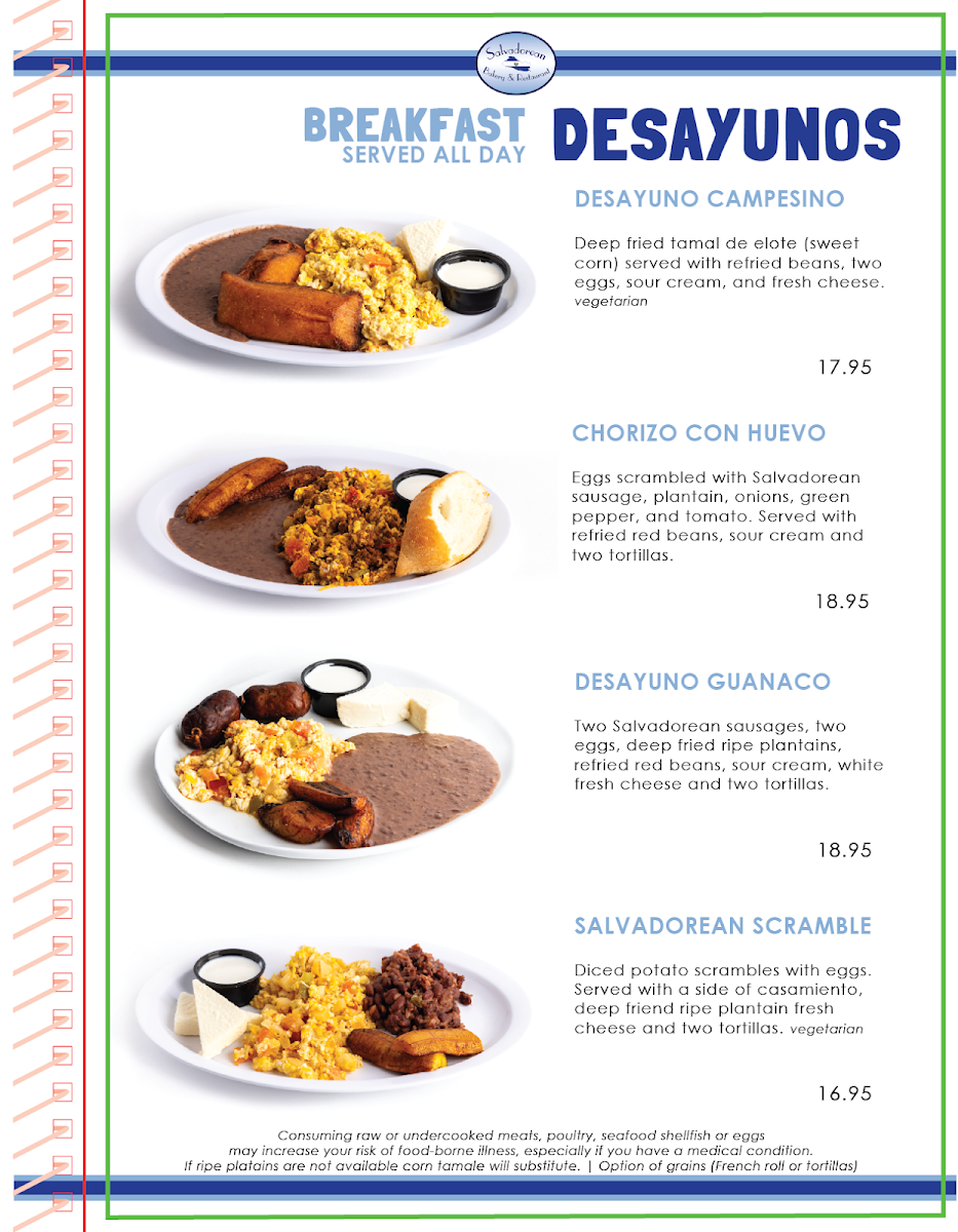 Salvadorean Bakery & Restaurant in Seattle offers an authentic taste of El Salvador through its vibrant, flavorful menu. Their breakfast options are a hearty celebration of traditional ingredients and bold flavors. The Carne Deshilada features tender shredded beef scrambled with eggs, onions, and peppers, accompanied by casamiento—seasoned beans and rice—plantains, sour cream, and warm tortillas. The Chorizo con Huevo combines savory Salvadorean sausage with eggs and fresh vegetables, delivering a satisfying and comforting start to the day.